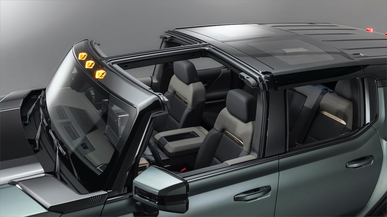 This new Hummer will come standard with the Infinity Roof and offers the option for Transparent Sky Panels. This design allows you to remove four panels and the front I-Bar and to lower the power Rear Drop Glass for an open air ride.